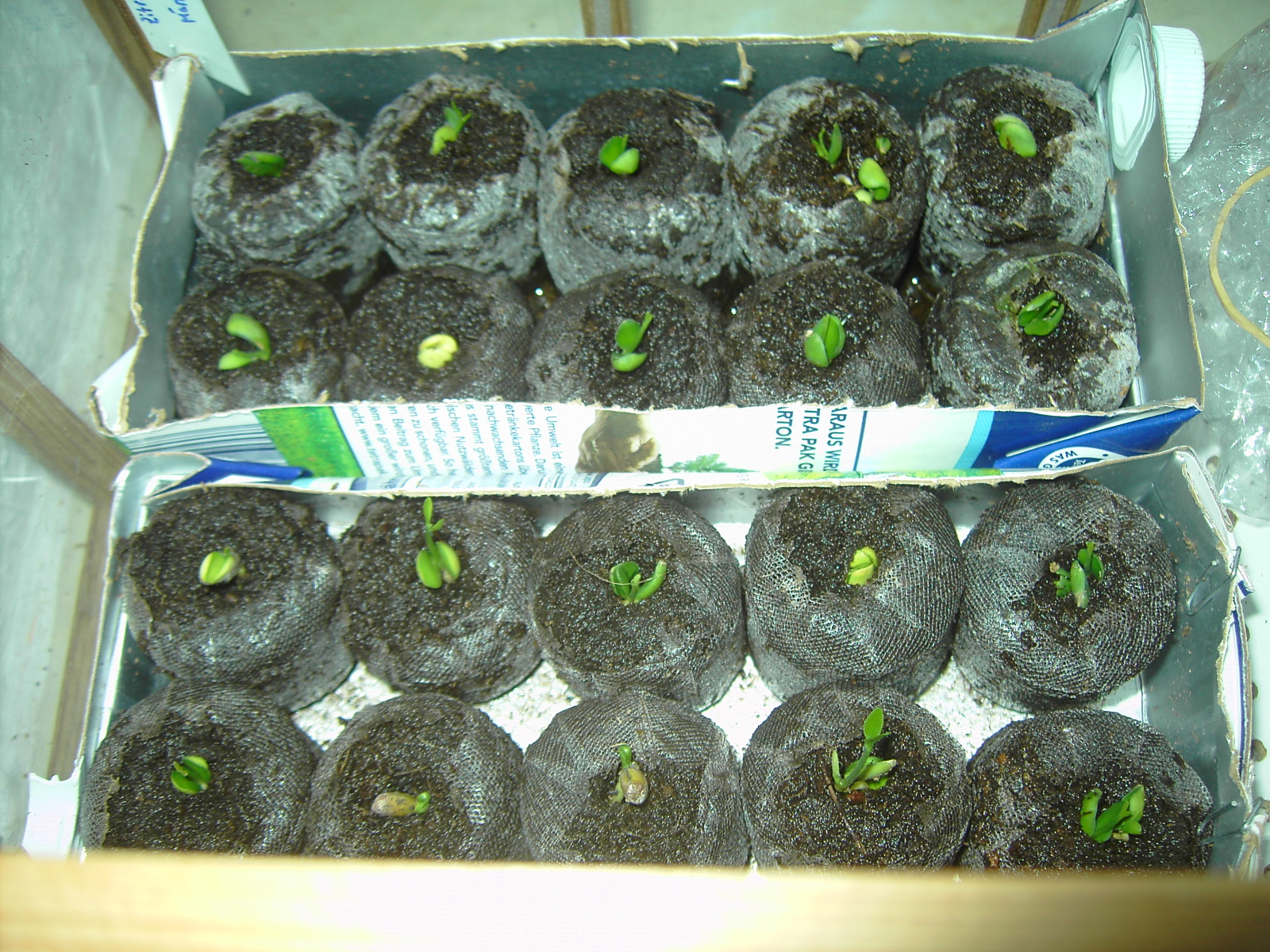 Bin aber sowieso total überrascht, dass die Clementinen so Lebenszeichen zeigen, da die ich eher damit gerechnet habe, dass die gleich vertrocknen, weil sie doch ni mehr so ganz frisch waren. Blätter hatte ich alle abgemacht und dann in Anzuchterde mit ner halben Saftflasche ohne Deckel übergestülpt.