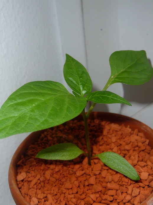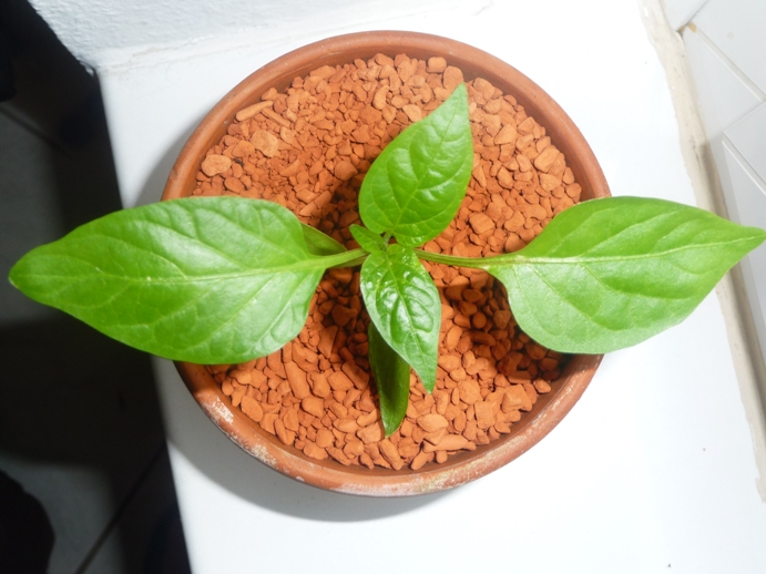 hab extra nochmal in der Erde gepult, weil ich 3 Kerne drin hatte und nur zwei gekommen sind und den Kern, den ich gefunden habe, war eindeutig zu groß für Paprika/Chili-Kern...