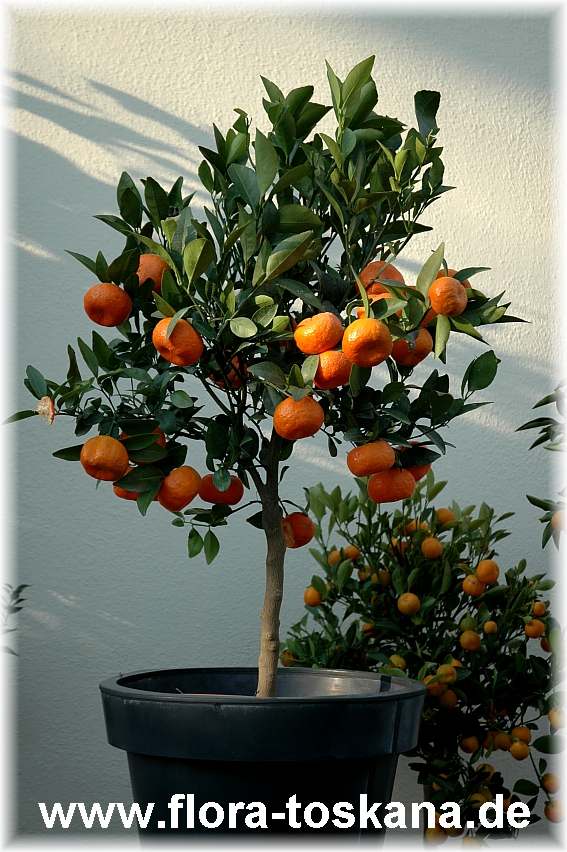 Die Qualität aller Arten & Sorten, die zur Gruppe der Mandarinen zählen, liegt zum einen in ihrem kompakten Wuchs, bedingt durch die kurzen Abstände zwischen den Blättern (Internodien). Das Laub ist etwa dreimal so lang wie breit und wirkt dadurch schmal und elegant. »Flügel« an den Blattstielen sind bei den reinen Arten nicht vorhanden, nur bei Kreuzungen wie den Tangelos. Charakteristisch ist der Duft der Mandarinen-Blätter: Ihre ätherischen Öle sind erfrischend herb- süß, ebenso die Blüten. Sie öffnen sich in riesiger Zahl nahezu gleichzeitig über einen Zeitraum von drei bis vier Wochen, meist im April oder Mai, je nach Überwinterung auch im Juni. Durch die Gleichzeitigkeit braucht man sich über die Bestäubung der Blüten keine Gedanken zu machen: Der Fruchtansatz ist überreich und garantiert hohe Erntemengen. Da die Früchte mittelgroß sind, reifen sie nicht nur zügig heran. Jede Pflanze kann schon von Jugend an eine Vielzahl von ihnen ernähren und zum Ausreifen bringen. Und bis zur Ernte erhöhen die kräftig orangefarbenen Schalen den Zierwert der Pflanzen weiter.