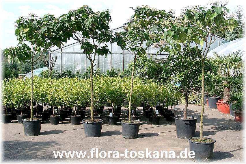 Laubabwerfender, bis 400 cm hoher Strauch oder Baum mit großen, weißen Blütenständen von Spätsommer bis Winteranfang.