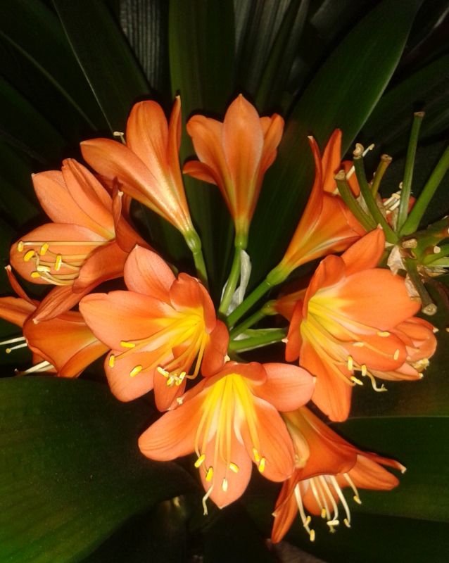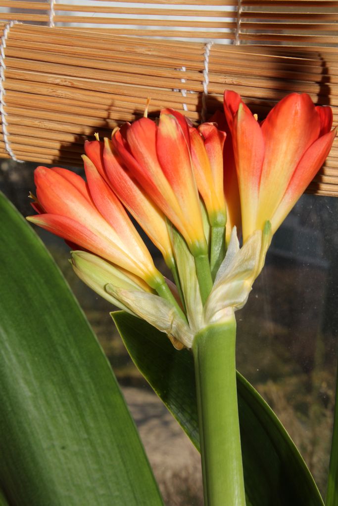 Diese Clivie habe ich vor etwa einem Jahr in abgeblühtem Zustand für 2 Euro vom Baumarkt-Wühltisch gerettet. Jetzt schiebt sie Blüten, auch wenn die noch etwas weit unten zwischen den Blättern stecken.