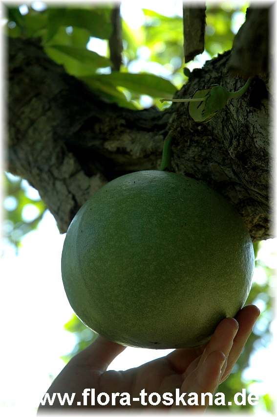 Info: tropische Nutzpflanze; getrocknete Fruchtschalen als Gefäße verwendbar; im Alter dickstämmiger & großblättriger Tropenbaum