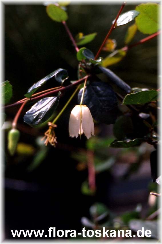 Info: weiße Maiglöckchenblüten im Spätsommer oder Winter; langsamwüchsig; immergrün, bis 250 cm hohe Sträucher mit roten (C.- hookerianum) oder weißen Blüten (C. patagua), die an langen Stielen hängen. Blütezeit ist von Frühjahr bis Herbst.