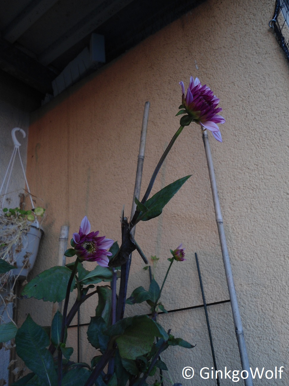Jetzt, wo die Herbststürme auch zunehmen, hab ich sie nochmals mit Bambusstäben stabilisiert. Ein paar Blüten bringt die "Balkonqueen" gerade noch, wenn auch nur kleine... Gott, sind die niedlich! Geradezu bemerkenswert niedlich, die Dahlie selbst: wow, riesig geworden, das Teil! Der dickste Austrieb bestimmt drei Finger dick...