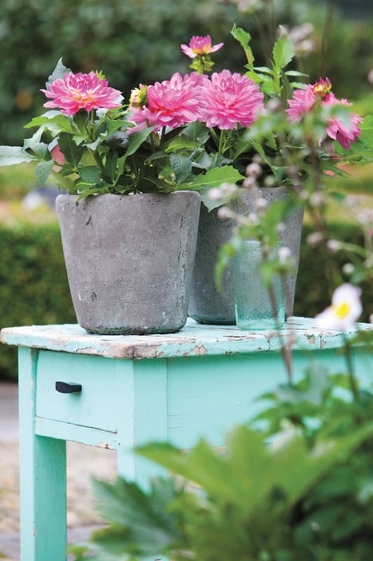 Da wir im Sommer einen Großteil unserer Freizeit draußen beim Frühstücken auf der Terrasse, relaxen auf der Sonnenliege, Abendessen mit der ganzen Familie am Gartentisch oder Genuss eines Glases Wein bei Kerzenschein verbringen, lohnt es auf jeden Fall, sich ein paar Gedanken zur Bepflanzung zu machen. Im Sortiment der Sommerblüher stehen die Dahlien mit ihren wunderbaren großen Blüten ganz vorne. Dahlien passen perfekt zum Großmutter-Chic, der über die internationalen Laufstege läuft. In einschlägigen Mode- und Wohnmagazinen paaren sich Shabby-Look, Vintage und Understatement mit teurem Design. Omas Garderobe und ihre Wohnaccessoires von Anno Pief sind wieder hochaktuell: von Perlenketten bis zu Blümchenmustern, von hautfarbenen Flatterkleidchen im Negligée-Look bis zu formgebenden Miedern, von Strick- und Wickeljäckchen bis zu Ohrensesseln mit modernem Stoffbezug, von Tapeten mit alten Mustern bis zu Patchworkdecken, Quilts und Paradekissen.