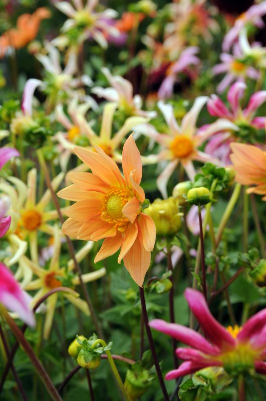 Im Dahliensortiment kann sich jeder austoben: die Konventionellen bleiben vielleicht bei einer Farbe und kombinieren mit Stauden, die Unangepassten setzen auf schreiende, kontrastierende Töne und expressive Formenvielfalt, die Softies schwelgen im Reich der pudrigen, sanften Pastelle und die Wankelmütigen können sich angesichts der riesigen Auswahl möglicherweise gar nicht entscheiden. Letzteren sei versichert: Sie müssen unbedingt, denn ein Sommer ohne Dahlien ist wie Surfen ohne Brett. Und das geht gar nicht!