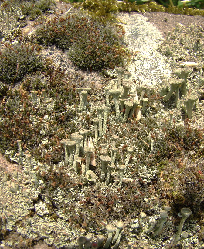Die "Bäumchen" (Sporophyten) darauf sind durch Befruchtung entstanden. Sie sind diploid. Sie bilden die Sporen. Die "Becherchen" auf deinem Foto vom Dez 08 sind die Archegonien (ich glaube die größeren) und Antheridien, aus denen nach der Befruchtung diese "Bäumchen" wachsen. Die Becherchen sind auch auf dem Foto Rose.