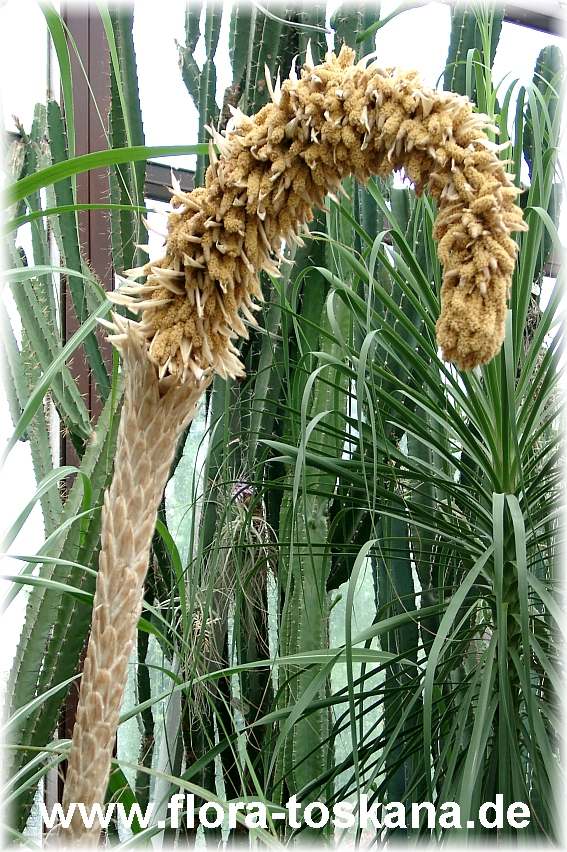 Schnitt: Mit dem Sprießen neuer Blätter aus der Mitte/Spitze heraus sterben jeweils einige der untersten und damit ältesten Blätter ab, die man nicht zu kurz abschneidet, damit sich ein dicker Stamm bildet bzw. erhalten bleibt.