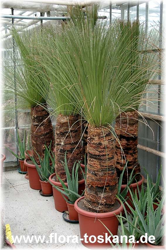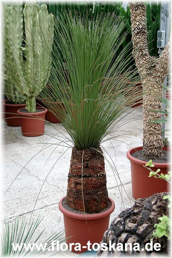 Dasylirion longissimum unterscheidet sich im Blatt deutlich von anderen Rauschopf-Arten. Zum einen haben sie keine aufgefächerten, sondern nur trockene Blattspitzen und keine Zähnung an den Blatträndern. Zum anderen sind die dunkelgrün gefärbten Blätter so schmal wie Mikadostäbchen, was diesem Rauschopf auch den Namen "Mikado-Pflanze" eingetragen hat. Berührt man die Blätter, rascheln sie gut hörbar. Die untersten bzw. äußersten Blätter neigen sich bogig über, so dass stärker wasserglockenartige Silhoutten als kugelförmige entstehen. Damit setzt Dasylirion longissimum in Innenhöfen, auf Terrassen, in Wintergärten und Büroräumen ganzjährig perfekte Akzente. Wie alle Rauschöpfe kommt auch diese Art mit trockener Luft, Hitze, Wasser- und Düngermangel bestens zurecht, im Winter wünscht sie sogar trockene Erde. Nähere Informationen zur Möglichkeit, Rauschöpfe im Garten auszupflanzen, finden Sie unter "Dasylirion wheeleri".