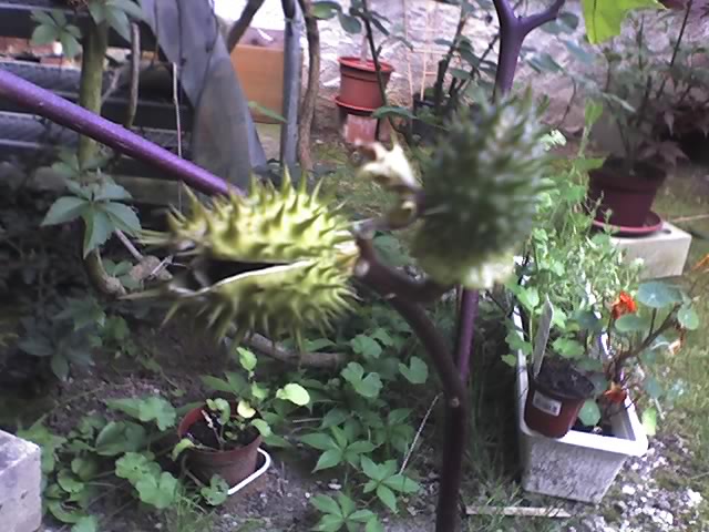 hier ist meine Datura metel. Sie bildet im Moment viele Samenkapseln. Sie ist ca. 2 m hoch und auch in diesem Frühjahr ausgesät.