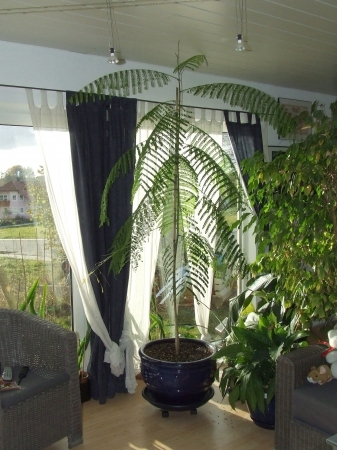 Raumhoch, d.h. ab Topfoberkante gute 2 m, die Pflanze stößt jetzt an der Decke an und benötigte für ihre Wedel eine Breite von gut 1,20 m