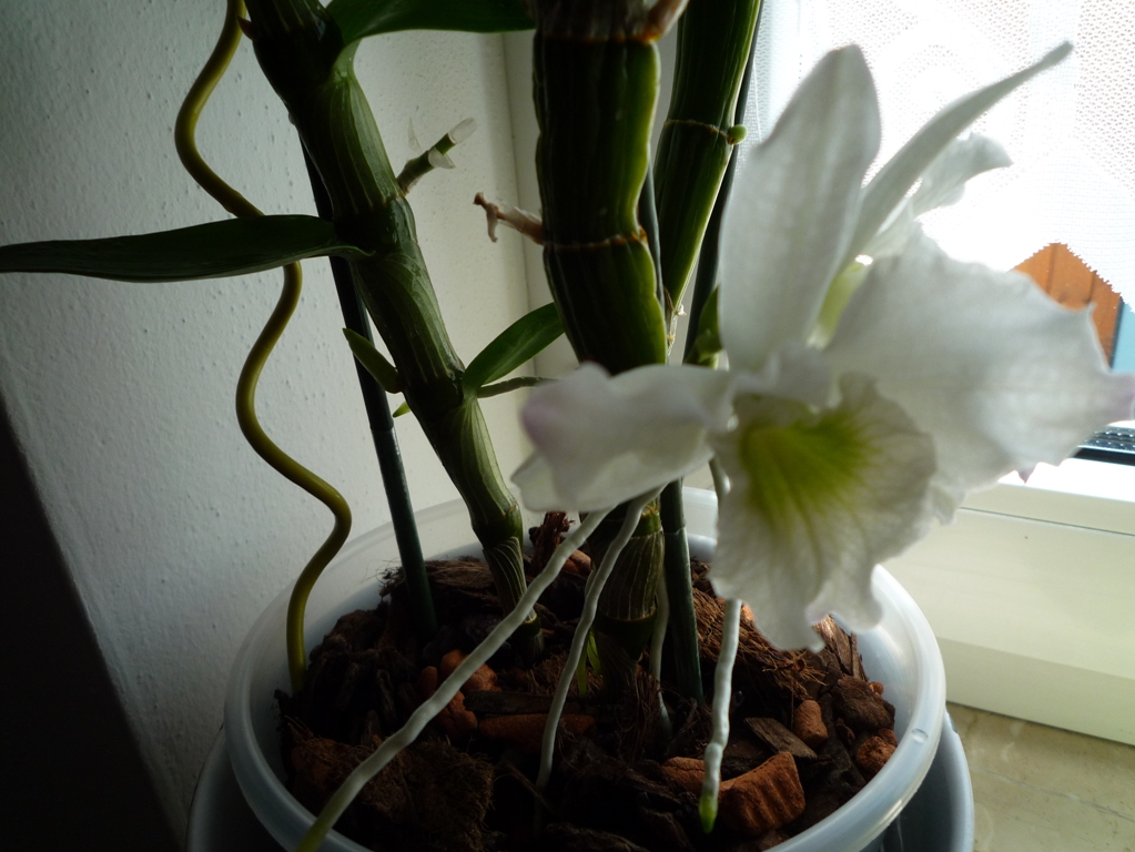 Hallo, ich brauche wieder mal eure Hilfe und zwar hab ich im Herbst letzten Jahres eine Orchidee vom Müll gerettet. Sie lag da bereits eine Weile. Ich bin mir nicht ganz sicher ob es ein Dendrobium nobile oder phalaenopsis ist, tippe aber eher auf eine phalaenopsis. Jedenfalls war sie zum Zeitpunkt als ich sie gefunden habe sehr hellgrün, was sich bis heute auch noch nicht geändert hat. Einige Kindel konnte ich auch nach einer Weile entfernen, da diese dann braun geworden sind, von unten her. Jetzt sind noch drei Triebe übrig, bei allen jedoch konnte ich von einem Monat das zu letzt getriebene Blatt (was sich schon vor der Landung auf dem Müll gebildet hat) rausziehen. Und da ich da mal was gehört habe, wenn man Blätter so einfach rausziehen kann, wollte ich mal fragen, ob´s da überhaupt noch Hoffnung gibt, oder ob ich sie da entsorgen kann. Seitdem steht sie da und es passiert rein gar nichts. Vielleicht bildet sie ja auch erstmal Wurzeln? Ich häng euch mal ein Foto an. Da könnt ihr mir gleich mal sagen was ihr denkt, ob nobile oder phalaenopsis!