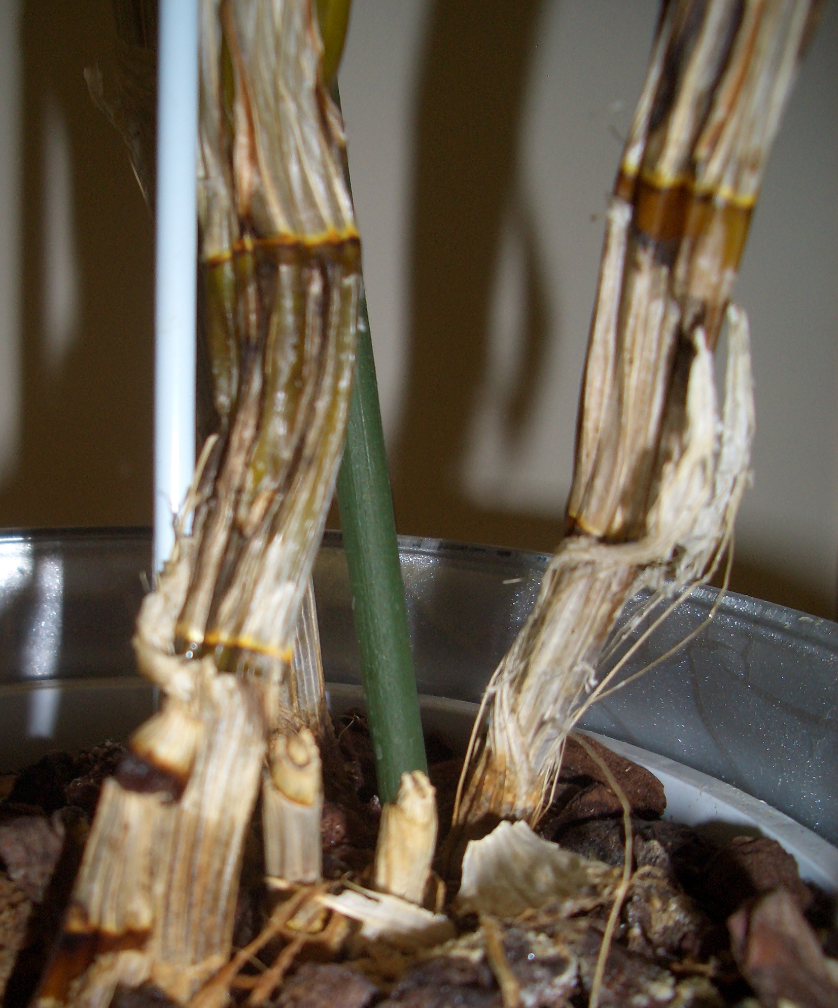 Nur an einer Stelle ist ein neuer Stängel vom "Hauptstängel" herausgewachsen, und ich weiß nicht ob ich ihn einpflanzen soll oder ob er da bleiben soll.