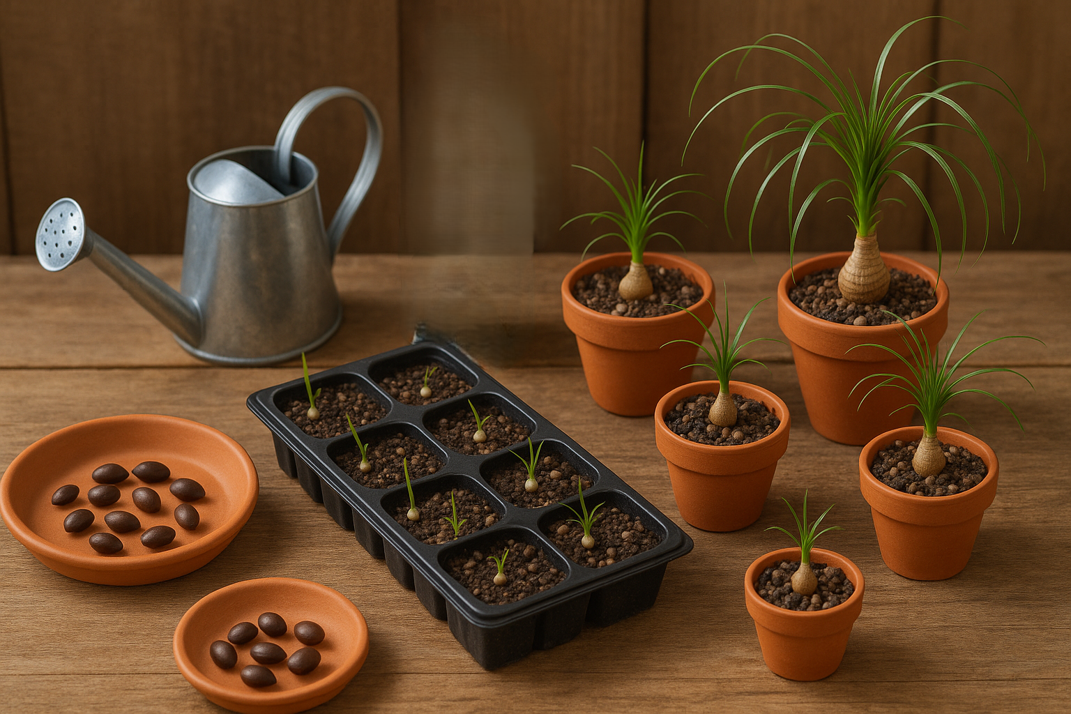 - **Beaucarnea recurvata:** Der Klassiker mit dem typischen, flaschenförmigen Stamm und langen, schmalen Blättern.