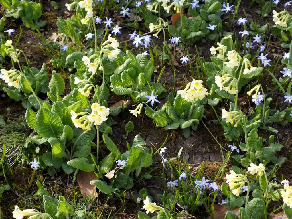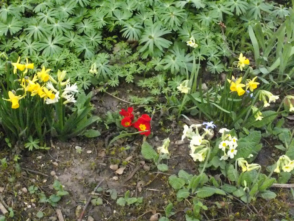 Bei mir im Hof blühen derzeit Narzissen, Tulpen, Primeln, Lenzrosen, tränendes Herz (!), Küchenschellen, Anemone blanda, Ranunkelsträucher und natürlich die Forsythien. Die Glockenblumen haben bereits Knospen. Gut ausgetrieben sind die Pfingstrosen und die ersten Spitzen der Lilien sind auch schon zu sehen.