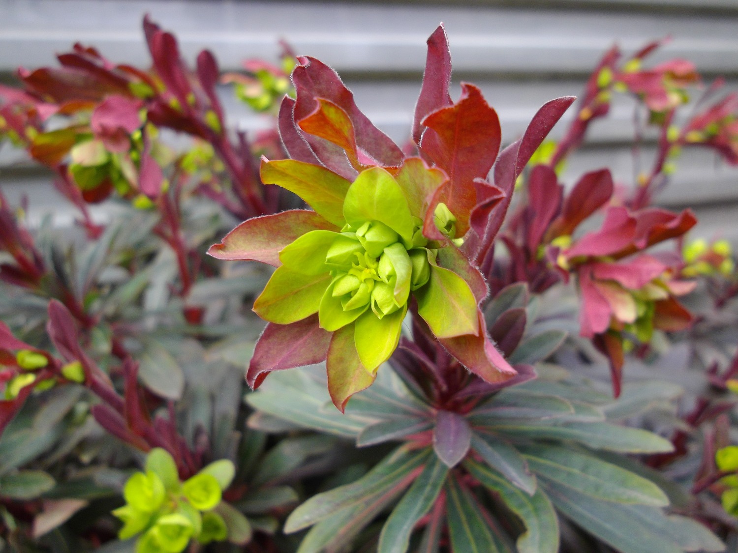 Aber ein ganz zuverlässiger legt jetzt bei mir los: Euphorbia amygdaloides 'Purpurea'