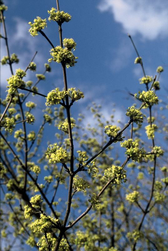 Die Kornelkirsche (Cornus mas) hat schon früh im Leben der Menschen eine wichtige Rolle gespielt. In Deutschland wird dieser große, manchmal baumartige Strauch nachweislich bereits seit dem Beginn des Mittelalters angepflanzt. Er wurde früher medizinisch genutzt, unter anderem von Hildegard von Bingen, die ihn gegen Gicht und Magenbeschwerden empfahl. Heute schätzt man die Kornelkirsche vor allem wegen ihres Zierwertes und ihrer großen Bedeutung für die heimische Tierwelt, unter anderem als wichtige und frühe Nahrungsquelle für Bienen und Schmetterlinge. Die strahlend gelben Blüten bilden hübsche kleine Dolden, die im März in großer Fülle erscheinen und gut zu erkennen sind. Aus ihnen entwickeln sich glänzendrote, säuerlich schmeckende Früchte, die ab August reifen und viel Vitamin C enthalten. Sie sind etwa kirschgroß und lassen sich gut zu Marmelade, Saft, Obstwein oder Kompott verarbeiten. Die Kornelkirsche hat grüne Blätter, die der Buntlaubigen Kornelkirsche - Cornus mas 'Tricolor' - sind dreifarbig: grün, gelb und rosa. Mit ihrer frühen Blüte, den interessanten Blättern und den Früchten im Herbst ist die Buntlaubige Kornelkirsche eine Pflanze, die über einen langen Zeitraum Abwechslung in den Garten bringt.