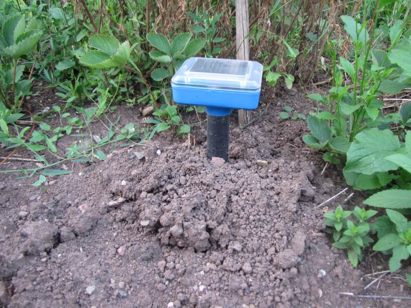 Ich habe eben dieses Foto gemacht. Da hat der Maulwurf doch tatsächlich direkt neben dem "Maulwurfschreck" seinen neuesten Hügel gebuddelt. Und das Gerät hat nicht etwa seinen Geist aufgegeben. Nein, es macht regelmäßig seinen Ton. Der Maulwurf sagt wahrscheinlich: "Klasse! Garten mit Radio für mich!"
