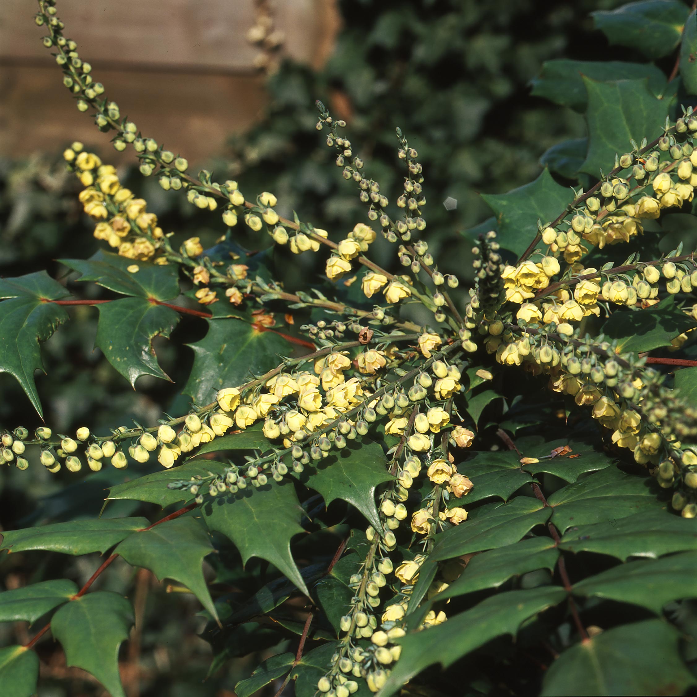 Die Schmuckblatt-Mahonie (Mahonia bealei) ist ein immergrüner Strauch mit sehr dekorativen Blättern. Er blüht schon gegen Ende des Winters: Je nach Witterung erscheinen im Februar oder im März hellgelbe, angenehm duftende Blüten, die einen wunderbaren Kontrast zu den ledrigen, dunkelgrünen Blättern bilden. Die Schmuckblatt-Mahonie gedeiht gut im lichten Schatten auf humosem, nicht zu trockenem Boden und kann je nach Standortbedingungen etwa 2 Meter hoch werden. Bei jungen Pflanzen empfiehlt sich ein Schutz vor austrocknendem Wind und das Abdecken der Wurzeln mit einer Schicht aus Laub.