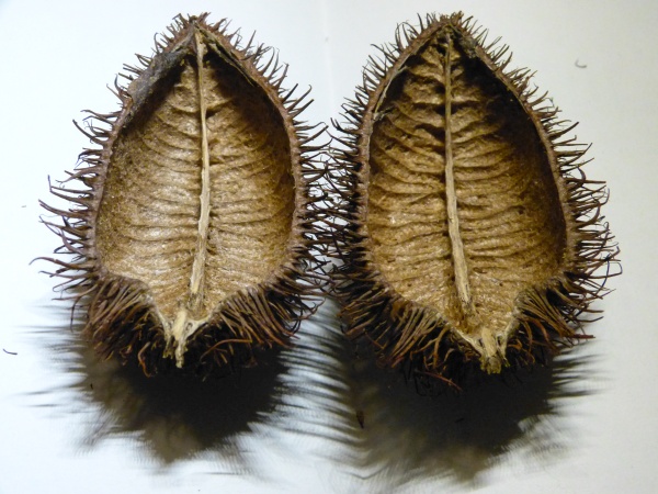 Die Samenkapsel gehört zu einem Annattostrauch (Bixa orellana). Die Originalfarbe ist knallrot, und im Inneren sind kleine, rote, ölige Samenkörner. Ich hatte die Kapsel von einer Kuba-Wanderreise mitgebracht. Die indigenen Völker Mittel- und Südamerikas hatten die roten Samenkörner in erster Linie als Körperbemalung verwendet, die Frauen dann als Lippenstift. Deshalb auch der eher umgangssprachliche Namen Lippenstiftbaum. Nachdem das Rätsel nun gelöst ist werde ich heute Abend einmal ein Foto meiner Pflänzchen hochladen.