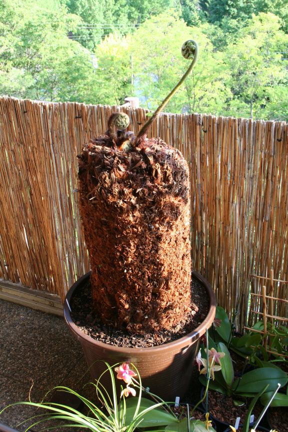 Baumfarne zählen zu den Dinosauriern unter den Pflanzen und haben schon vor Jahrmillionen das Bild unserer Erde geprägt. Da gerade diese Art von der Haltung her sehr unkompliziert ist, kann sich mittlerweile fast jeder diese besondere Pflanze nach Hause holen (genug Platz vorausgesetzt) und sich an dem exotischen Aussehen erfreuen. Dicksonia noch ohne Stamm gibt es z.B. beim Baldur-Versand für wenig Geld, größere Exemplare mit Stammhöhen von 40cm bis hin zu 2m gibt es in Spezialgärtnereien (die kosten dann mehrere 100,-? bis hin zu 1.000,-?) und ich habe das Exemplar, das auf den Fotos zu sehen ist bei ebay für 125,-? ohne Wurzeln erstanden. Wie man sieht treiben die Farnstücke aber relativ einfach wieder durch.