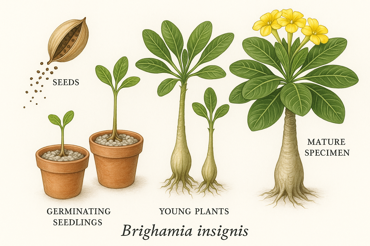 Die Vermehrung der Brighamia ist eine Herausforderung, aber auch eine lohnende Erfahrung. In der Natur wurde sie von einer heute fast ausgestorbenen Schwärmer-Art bestäubt. In Zimmerkultur muss die Bestäubung von Hand erfolgen. Mit einem kleinen Pinsel wird der Pollen von einer Blüte auf die Narbe einer anderen übertragen. Bei Erfolg bilden sich Kapselfrüchte mit feinen Samen. Die Aussaat erfolgt in einem sehr durchlässigen Anzuchtsubstrat bei hoher Luftfeuchtigkeit und Temperaturen um 25°C. Die Keimung kann mehrere Wochen dauern.