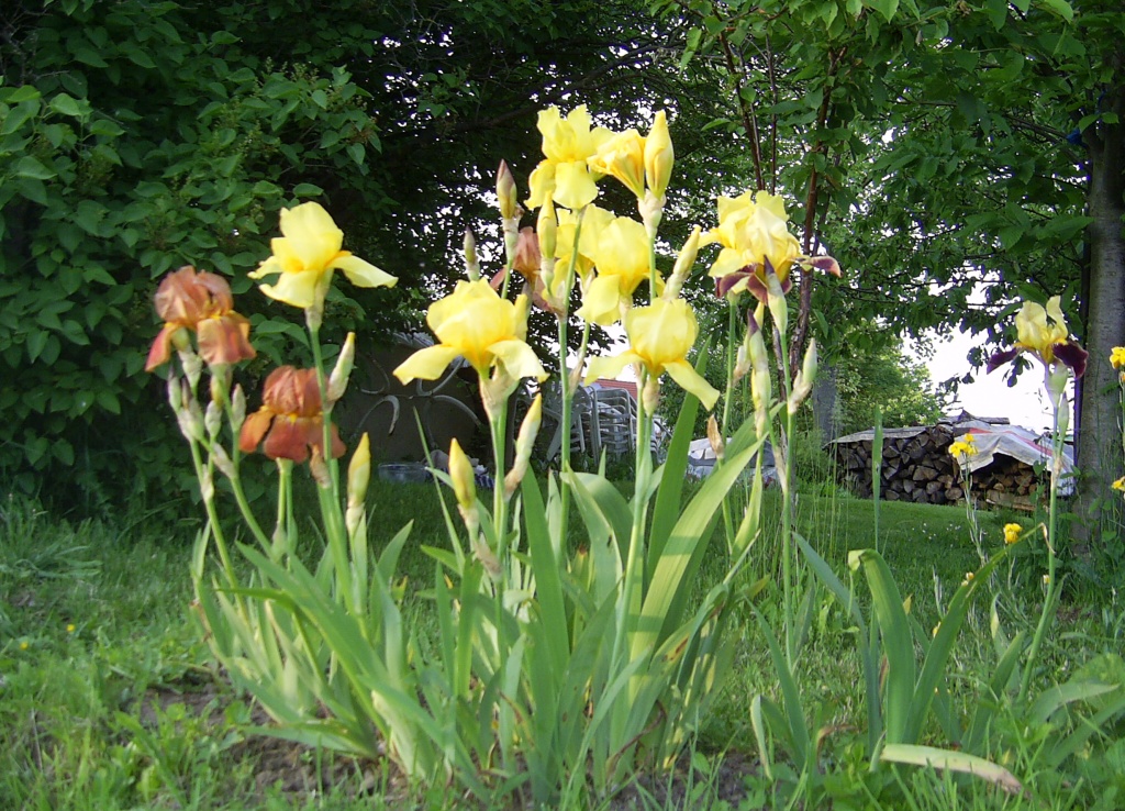 Hier mal ein Gruppenfoto meiner gelben, gelb-lila und "bronzenen" Iris. Da hab ich doch glatt mal versucht, die ein bisschen farblich aufeinander abgestimmt zu pflanzen