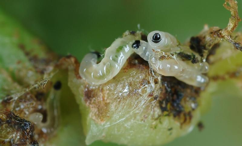 Die Larven, die eigentlichen Schaderreger, sind etwa 6-7 mm lang, besitzen einen glasigen Körper und einen schwarzen Kopf.
