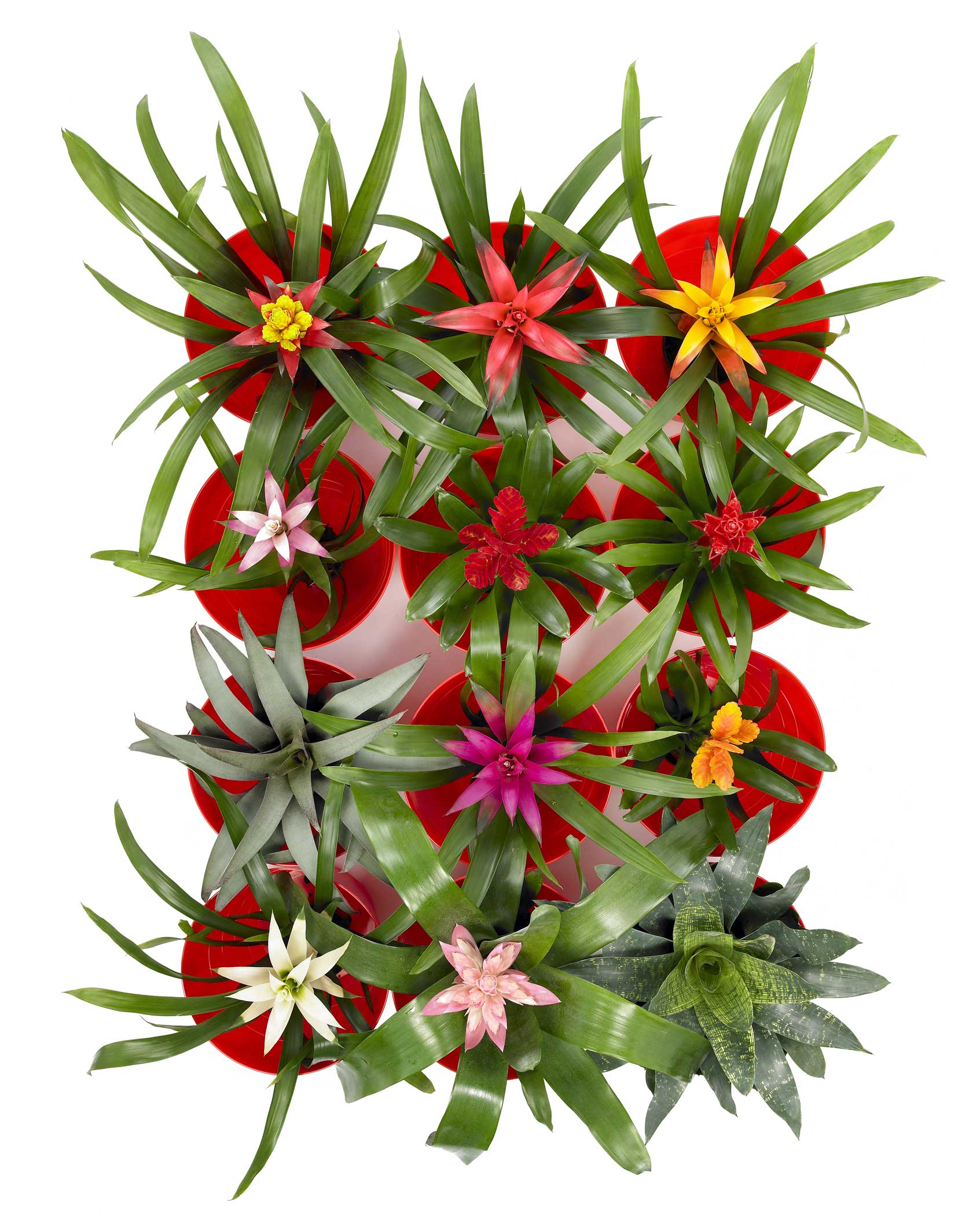 Etwa 300 Jahre ist es her, als deutsche und belgische Liebhaber der exotischen Bromelie die ersten Pflanzen nach Europa brachten. Durch umfangreiche Kreuzung und Selektion gibt es die ursprünglich überwiegend roten und rosafarbenen Bromelien inzwischen in Weiß, Gelb, Violett, Orange und sogar in knalligem Pink oder zweifarbig. Die Mehrzahl der Bromelien gehört zu den Aufsitzerpflanzen oder Epiphyten, die als Untermieter auf Zweigen von Bäumen oder anderen hohen Pflanzen wachsen. Um sich ausreichend zu versorgen, stehen bei vielen Bromelien wie z. B. Guzmania oder Vriesea die Blätter rosettenförmig zusammen, so dass sie einen Trichter bilden. Dieser kann enorme Mengen Wasser aufnehmen: Bis zu fünf Liter sammeln sich darin an. An dieser optimal geschützten Wasserstelle lassen sich übrigens mit Vorliebe die winzigen Pfeilgiftfrösche nieder, um sich in aller Ruhe ihrer Brut widmen zu können.