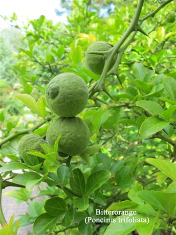 Im Sommer wirst du leider keine Blüten mehr sehen, die blühen im Frühling mit einem wundervoll zitronigen Duft. Meine Früchte sind schon Murmel groß und duften wenn sie reif sind auch sehr gut.