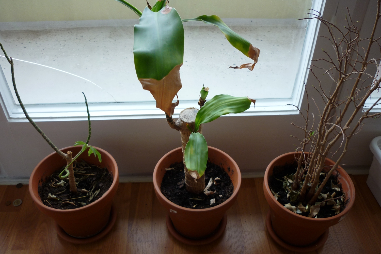 im April diesen Jahres habe ich aus der Arbeit ein paar vernachlässigte Pflanzen mitgenommen, und zwar eine Schefflera, einen Ficus benjamina und eine Dracaena fragrans. Die drei Pflanzen wurden Anfang des Jahres von den Kollegen in diese Tontöpfe umgetopft, aber dann haben sie vergessen, die Pflänzchen auch zu gießen...