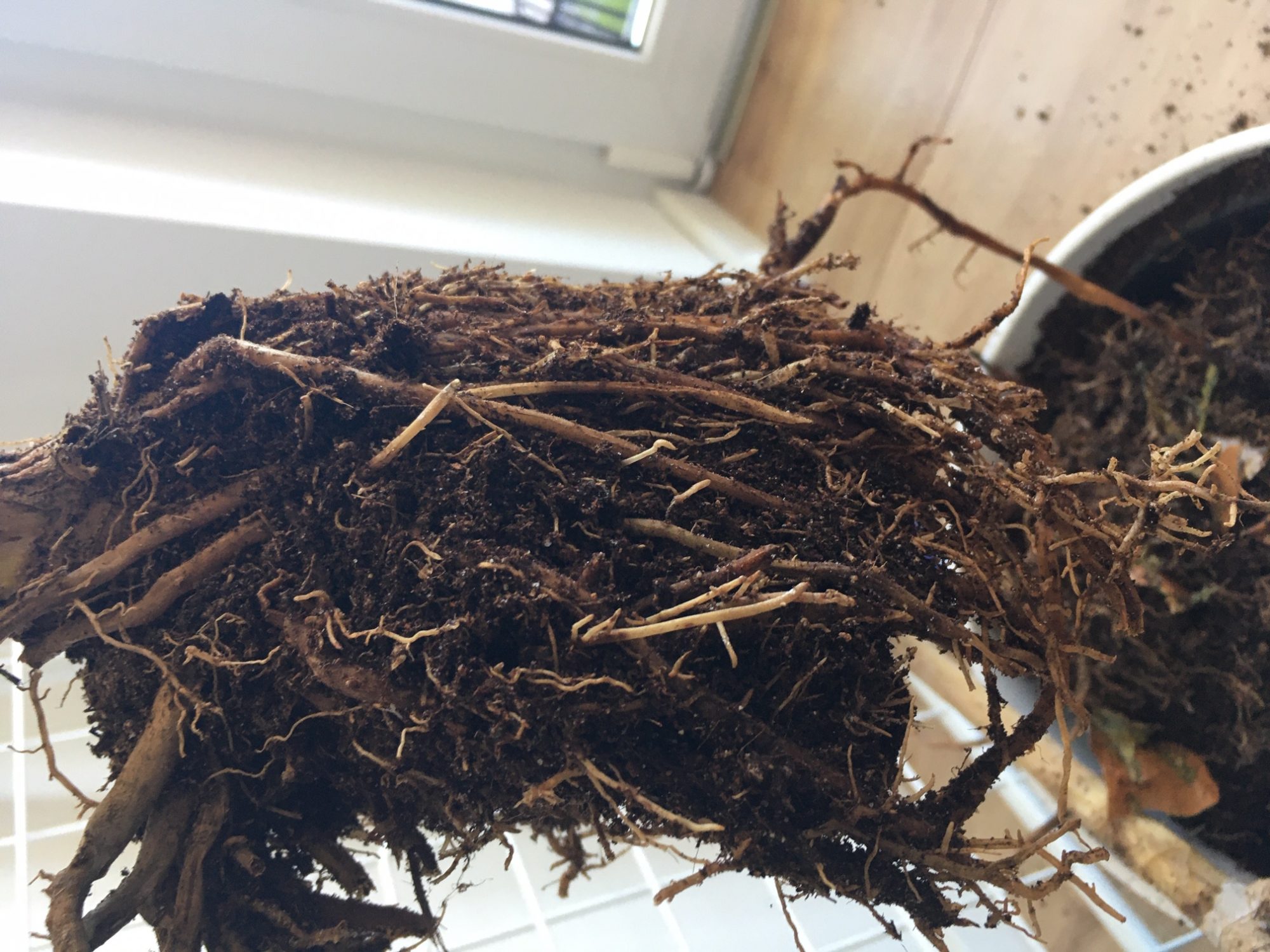 - viele Wurzeln die unten aus dem "Innentopf" herausschauen