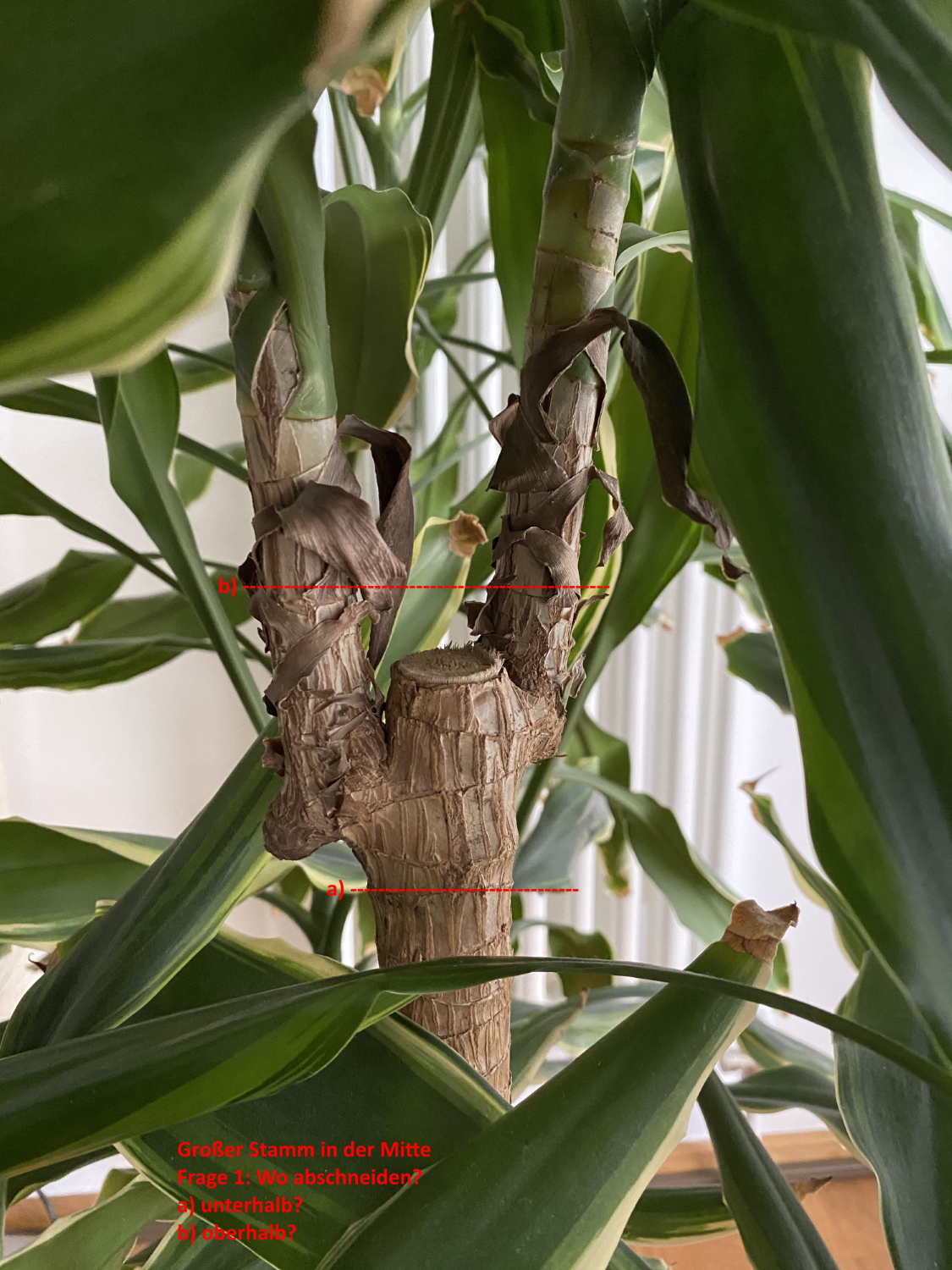3) Wenn wir mal beim Mittelstamm bleiben: Der ist ca. 50-60cm hoch. Soll ich den auf Position a) oder b) (siehe Bild) abschneiden. Oder geht beides führt aber zu unterschiedlichen Resultaten? Was wäre der Unterschied?