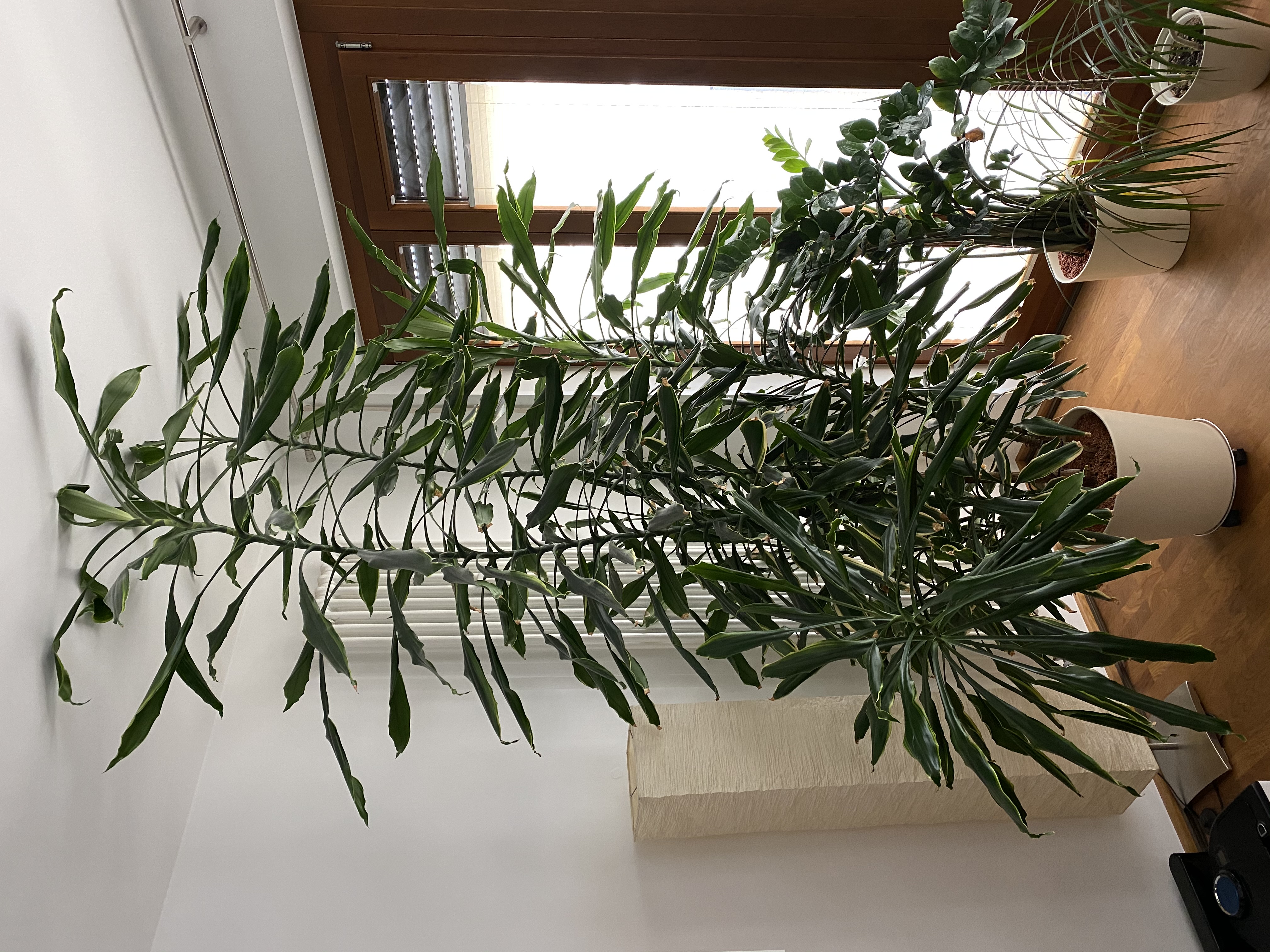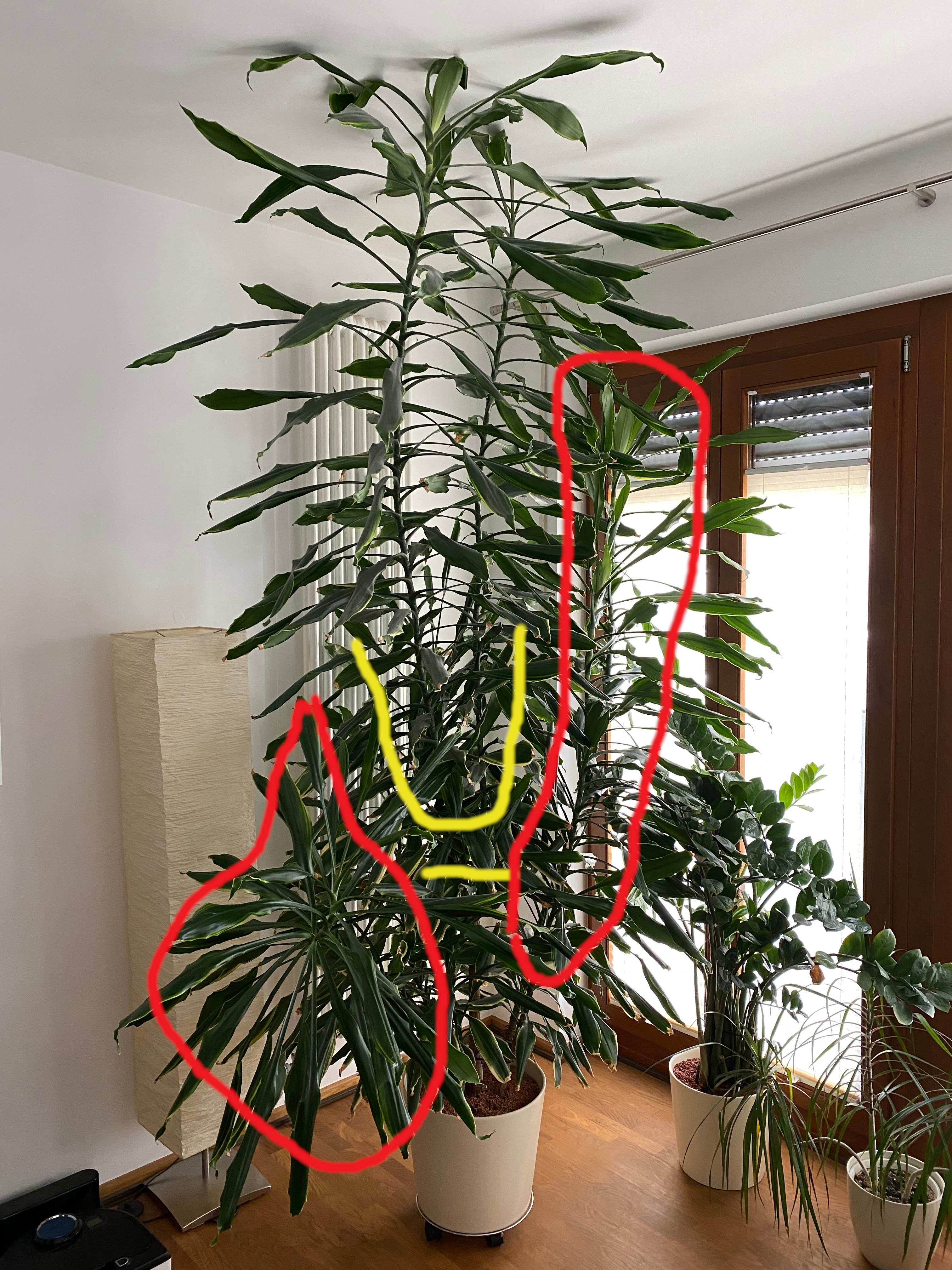 Meine Pflanze ist, wie ihr unschwer erkennen könnt, mir etwas über den Kopf gewachsen und soll nun sowohl in der Höhe, als auch Breite deutlich zurecht gestutzt werden. Ich habe in der Mitte einen Stamm und drumherum 3 kleine.