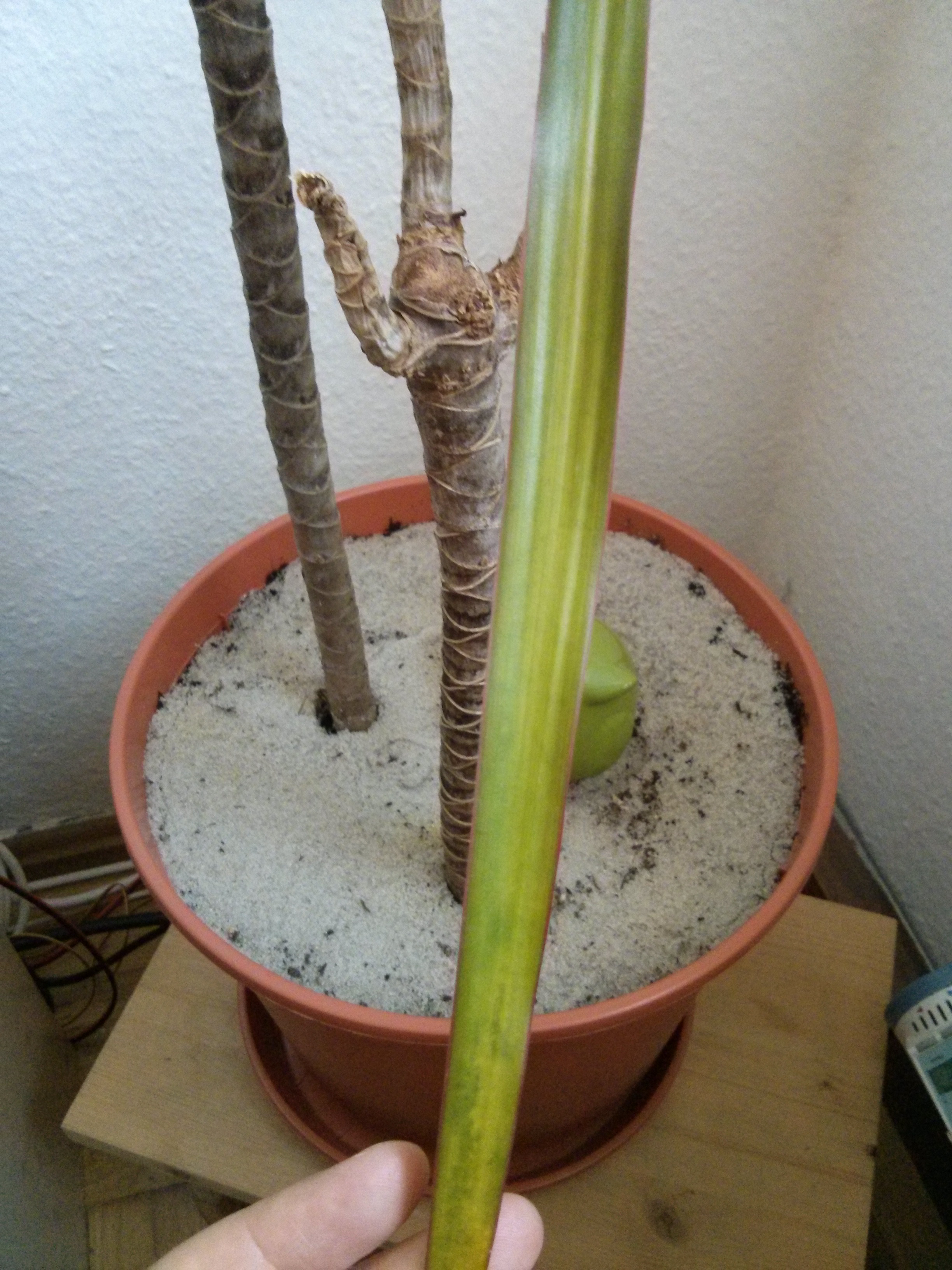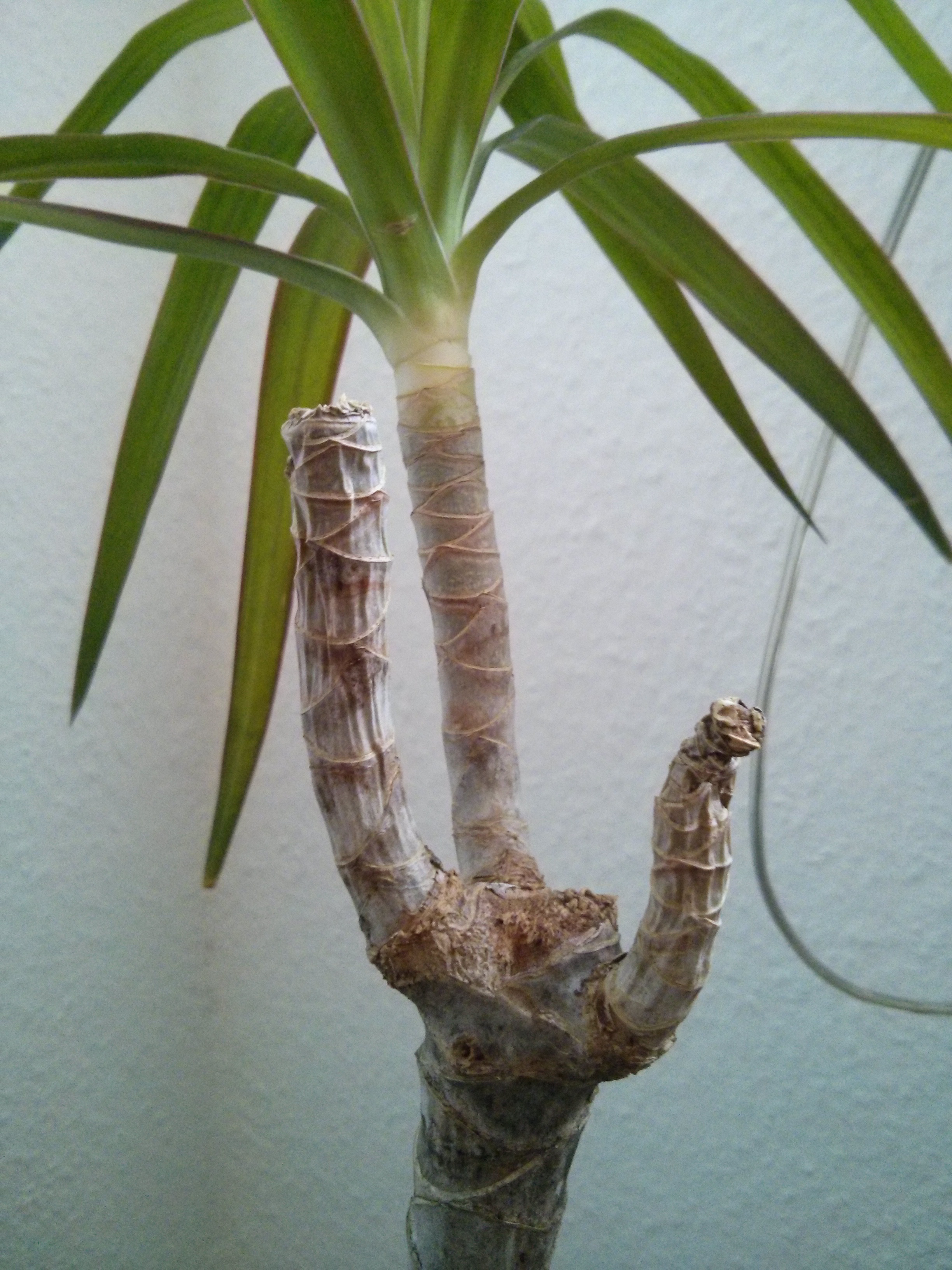So, nun zu meinem Problem. Die mittlere Pflanze, die 2 Triebe verloren hat, schwächelt ganz schön. Die Stämmchen der 2 Triebe werden weich und ich habe Angst, dass das auf den Hauptstamm übergehen wird. Dazu kommt, dass sie seit ca 1 Woche gelbe Blätter bekommt. Ich Depp hab die natürlich vor dem Foto abgemacht, aber ich denke, ihr wisst, wie gelbe Blätter an einem Drachenbaum aussehen. Es waren insgesamt 4 Stück. Ein fünftes, das gerade den ersten Gelbstich bekommt, ist noch dran und ich befürchte, dass es mehr werden.