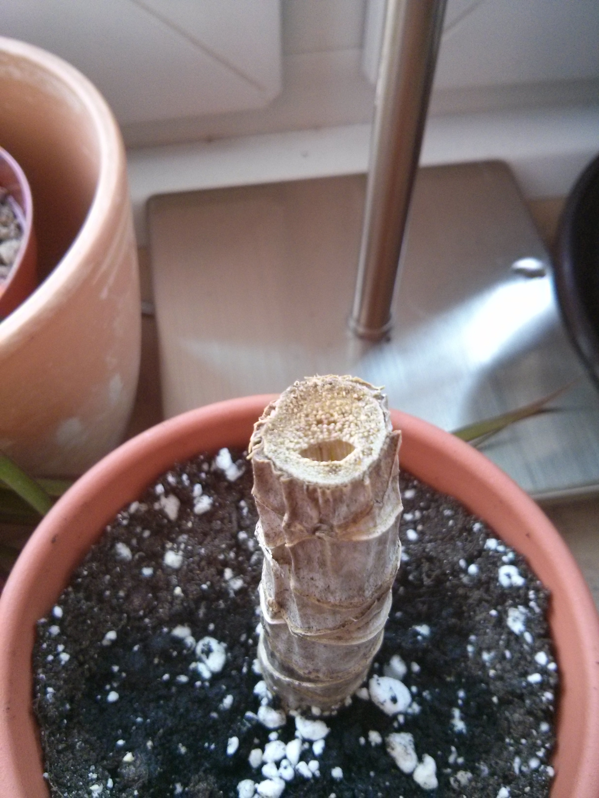 So, nun zu meinem Problem. Die mittlere Pflanze, die 2 Triebe verloren hat, schwächelt ganz schön. Die Stämmchen der 2 Triebe werden weich und ich habe Angst, dass das auf den Hauptstamm übergehen wird. Dazu kommt, dass sie seit ca 1 Woche gelbe Blätter bekommt. Ich Depp hab die natürlich vor dem Foto abgemacht, aber ich denke, ihr wisst, wie gelbe Blätter an einem Drachenbaum aussehen. Es waren insgesamt 4 Stück. Ein fünftes, das gerade den ersten Gelbstich bekommt, ist noch dran und ich befürchte, dass es mehr werden.