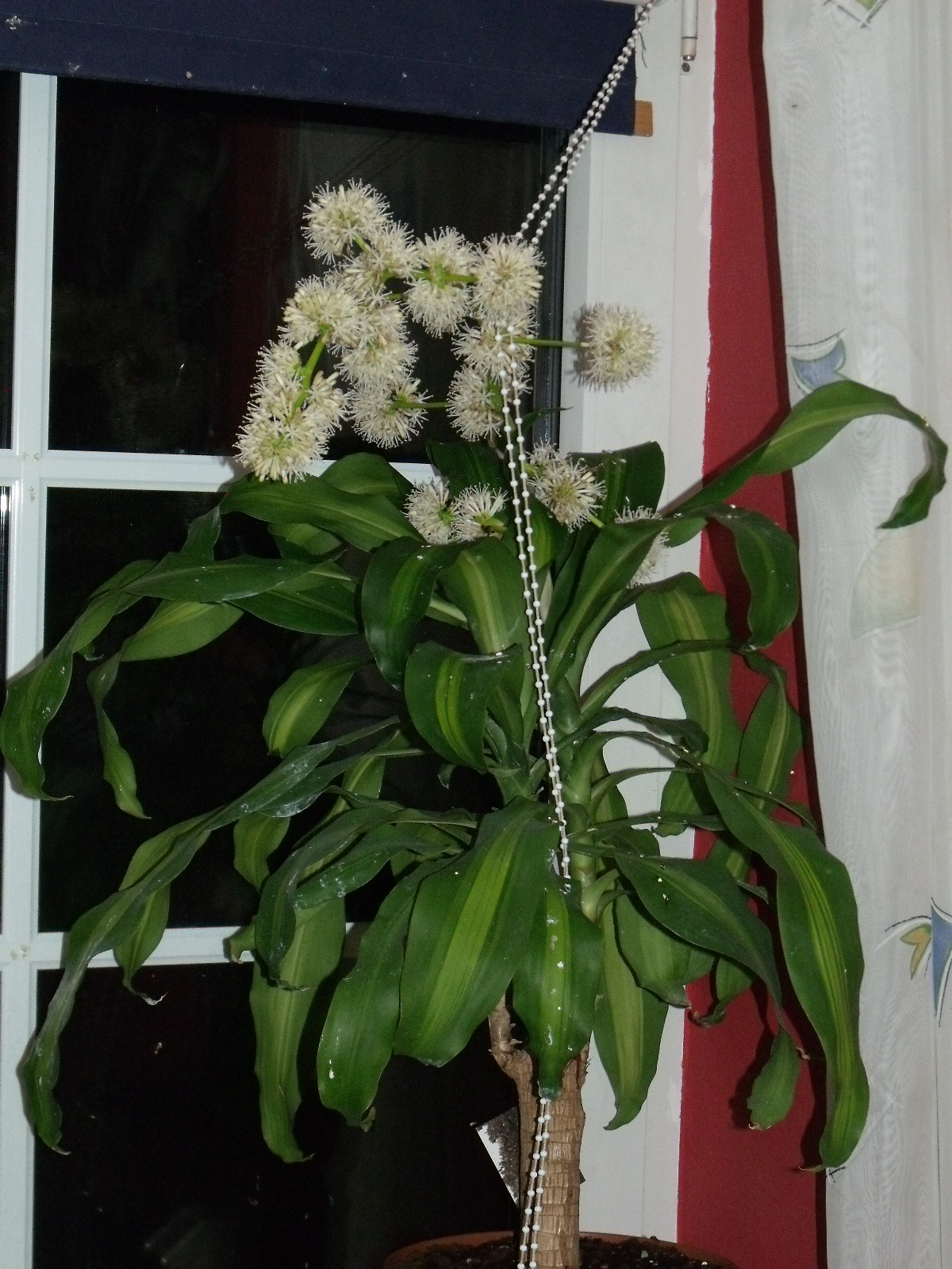 Vor 3 Tagen ist meinem Sohn erst aufgefallen, daß ein Dracaena fragans ??, den ich bei ihm im Zimmer aufgestellt habe (aus Platzmangel) in Blüte steht.!!!