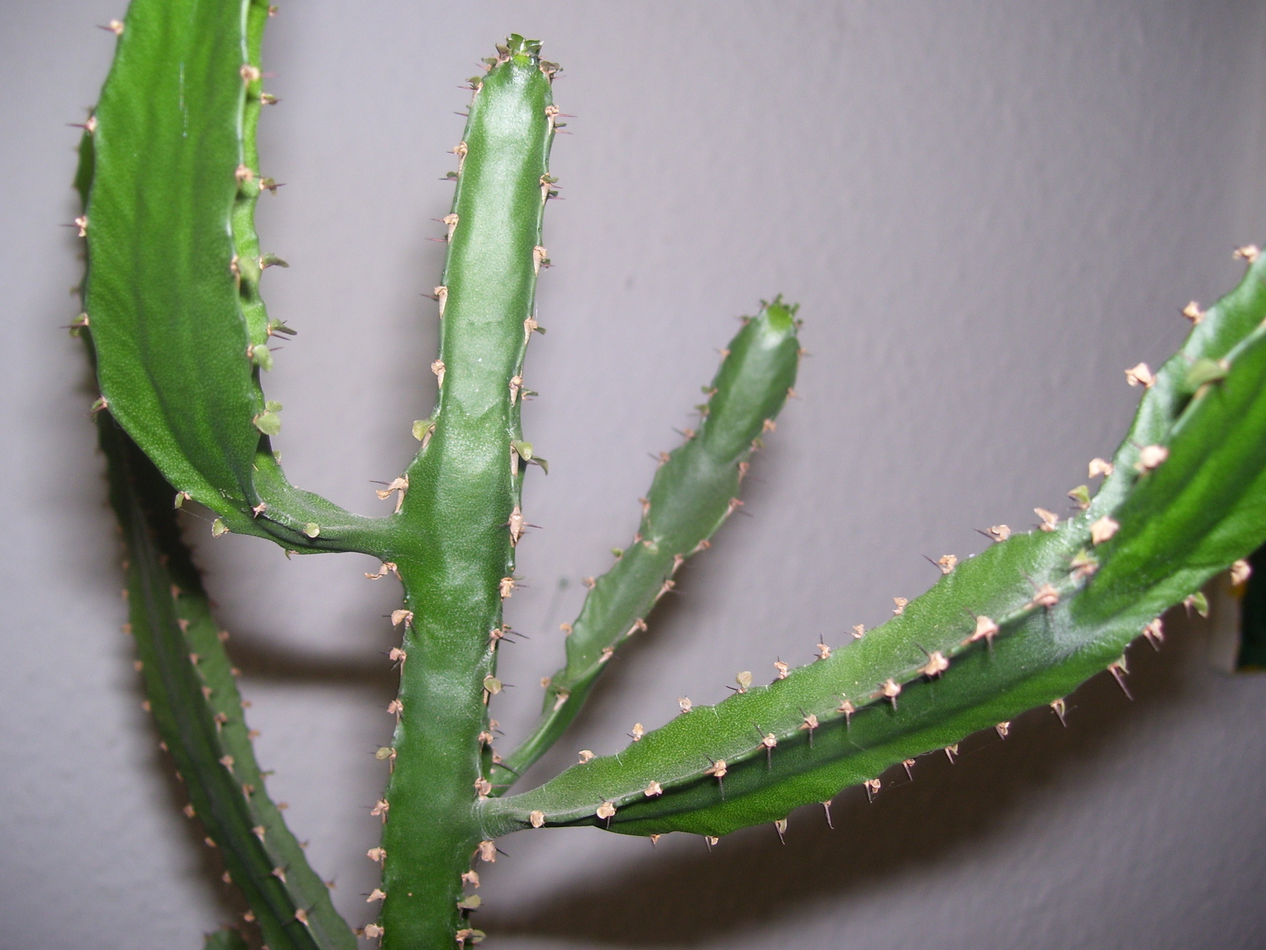 Seit mehreren Jahren habe ich eine Pflanze, auf der ursprünglich mal ein Kaktus aufgepfropft war. Die Pflanze ist dreieckig, aus der Mitte der ?Blätter? bilden sich teilweise Luftwurzeln. Kennt jemand den Namen?
