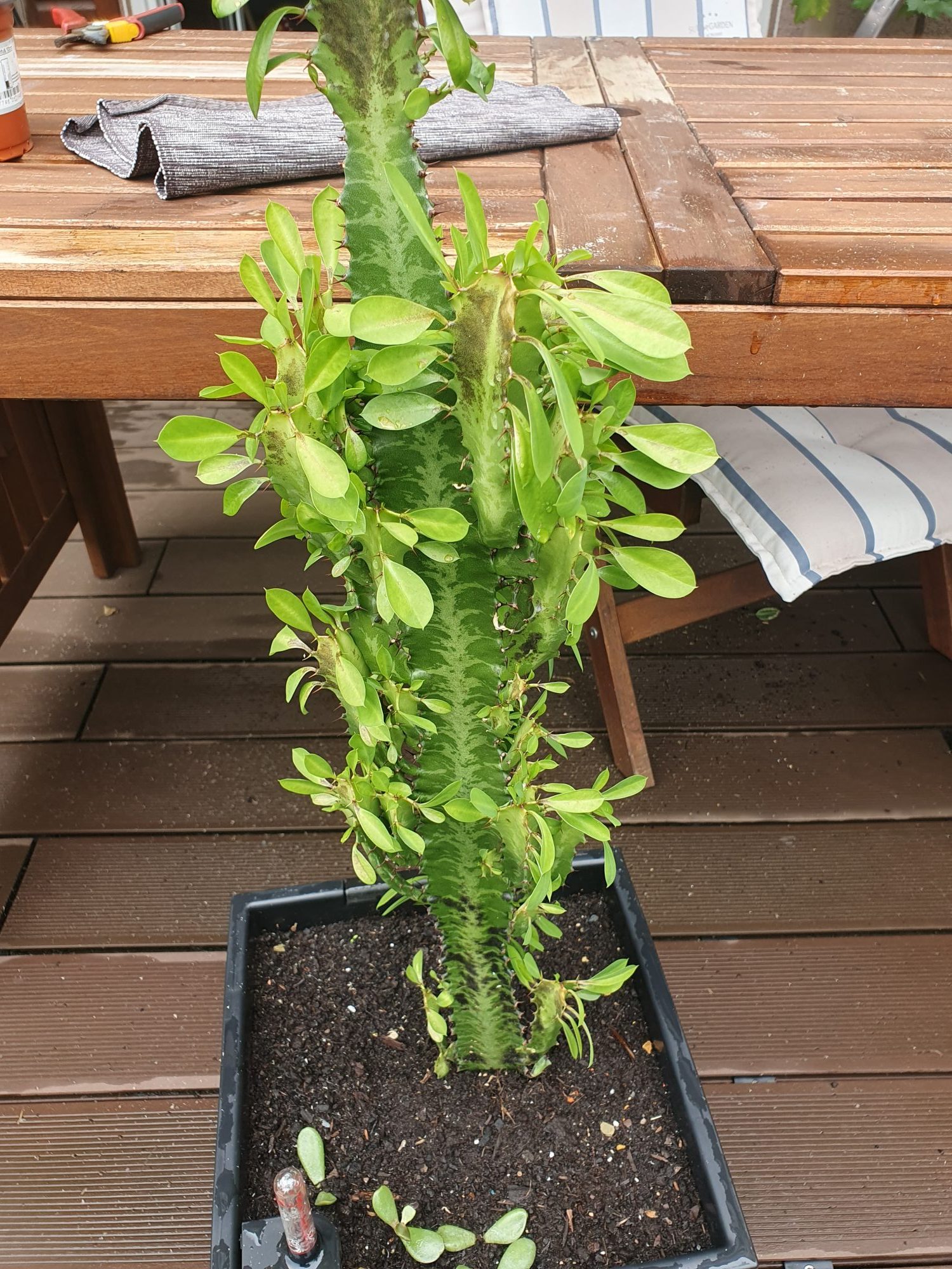 Hallo, ich habe vor 2 Wochen den Dreikantige Wolfsmilch gekauft und in einen Lechuza Topf mit Kakteenerde gepflanzt.