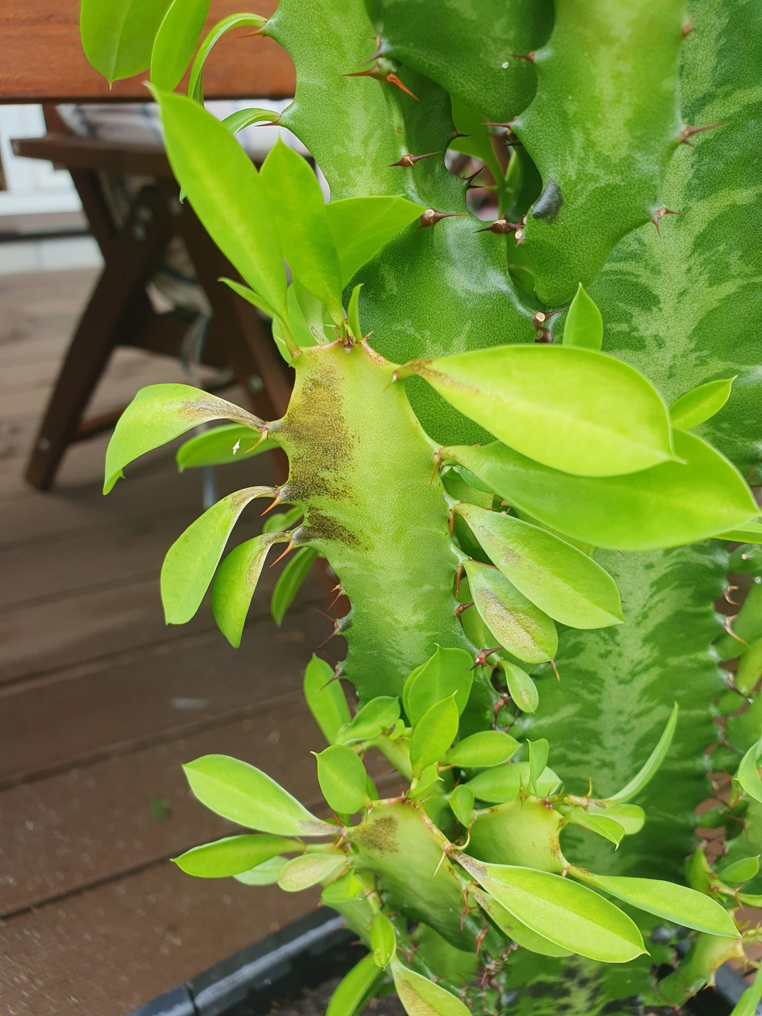 Dreikantige Wolfsmilch wird hellgrün, bekommt schwarze Flecken und Bläter fallen ab