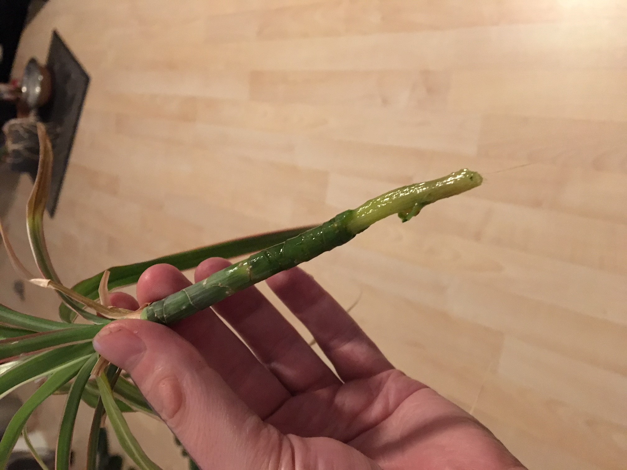 Das Problem ist, wenn ich den matschigen Teil des Stängels jetzt abschneide, bleibt vom Stängel bis auf die Blätter nicht mehr viel übrig. Vielleicht die obersten 2-3cm unterhalb der Blätter fühlen sich noch halbwegs fest an.