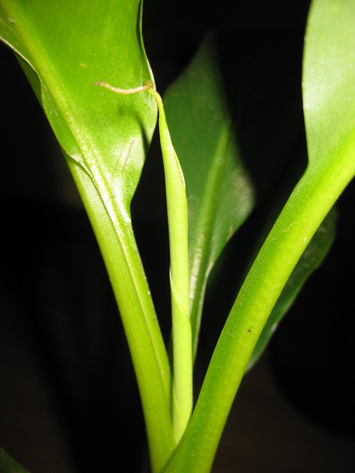 Gleich umgetopft (Blumenerde mit Kies gemischt), gegossen mit Superthrive und heute kommt schon das erste neue Blatt: Das war gestern Mittag noch nicht zu sehn!