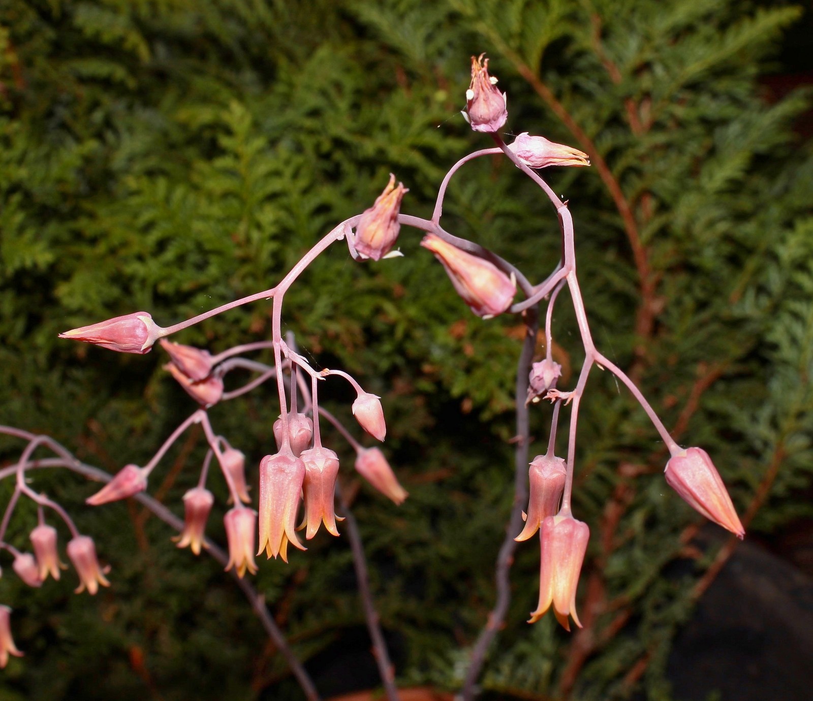 Blüte: bis 80 cm hohe Blütenstände mit sehr kleinen Blättchen; Blütenstand eine gabelig verzweigte, 4 bis 36blütige, 4 bis 20 cm lange Scheinrispe; Blüten mit 5 bis 14 mm langem Stiel; Kelchblätter klein; Blütenkrone röhrig bis krugförmig, 9 bis 14 mm lang und 6 bis 8 mm breit, rötlich, innen gelblich; Blütezeit April bis Juni.