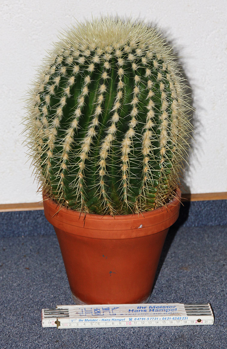 Habe gestern zwei tolle Geschenke erhalten. Das erste ist ein Echinocactus grusonii, der sich in einen 18 cm-Topf quetschen mußte (Gesamtgewicht ca. 7 kg). Heute habe ich ihm eine 25 cm-Schale spendiert, und ich hoffe, daß er sich darin wohlfühlt. Ist es vertretbar, reine Kakteenerde dafür zu verwenden, oder hätte ich eine mineralische Komponente beimischen müssen? Als Drainage habe ich eine dünne Schicht Blähton eingefüllt.