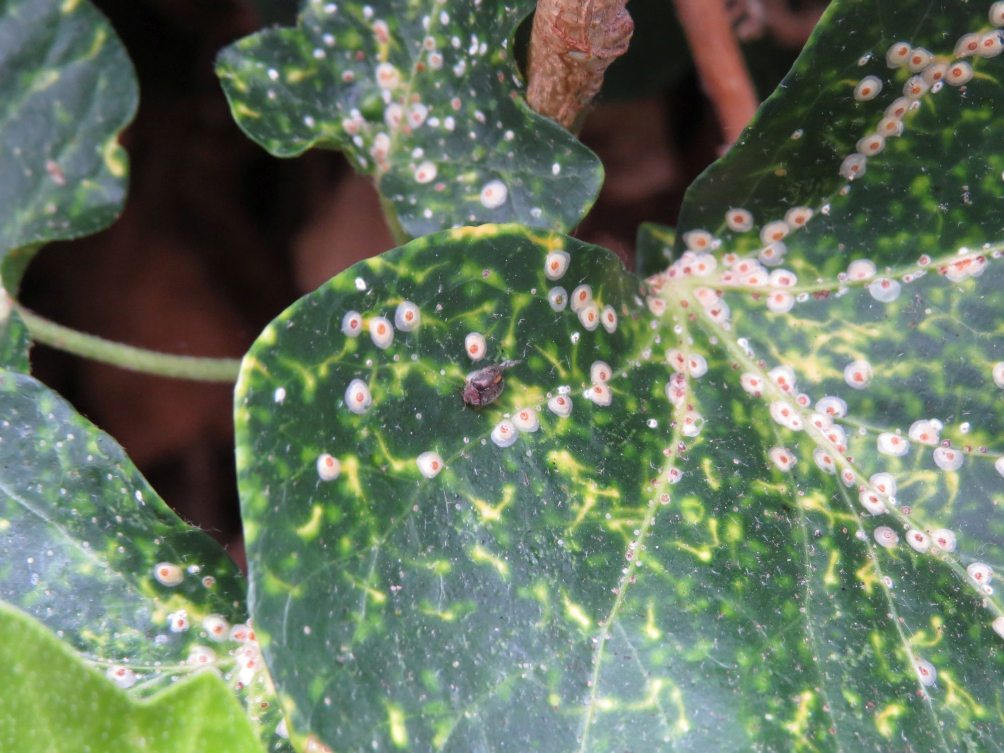 mein Efeu scheint von Schädlingen befallen zu sein. Viele Blätter haben Verfärbungen (siehe Bilder), nachfolgend auch ein Bild des vermutlichen Verursachers.