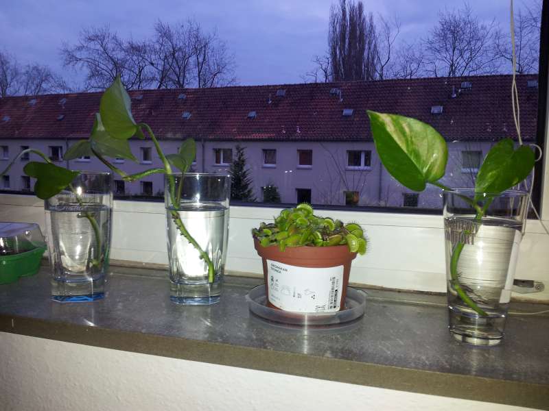 Das zwischen den Stecklingen ist übrigens die Venusfliegenfalle meines Freundes. Die darf ich nicht anfassen, spendier ihr aber trotzdem mal abundzu mehr Wasser, wenn er es vertüddelt