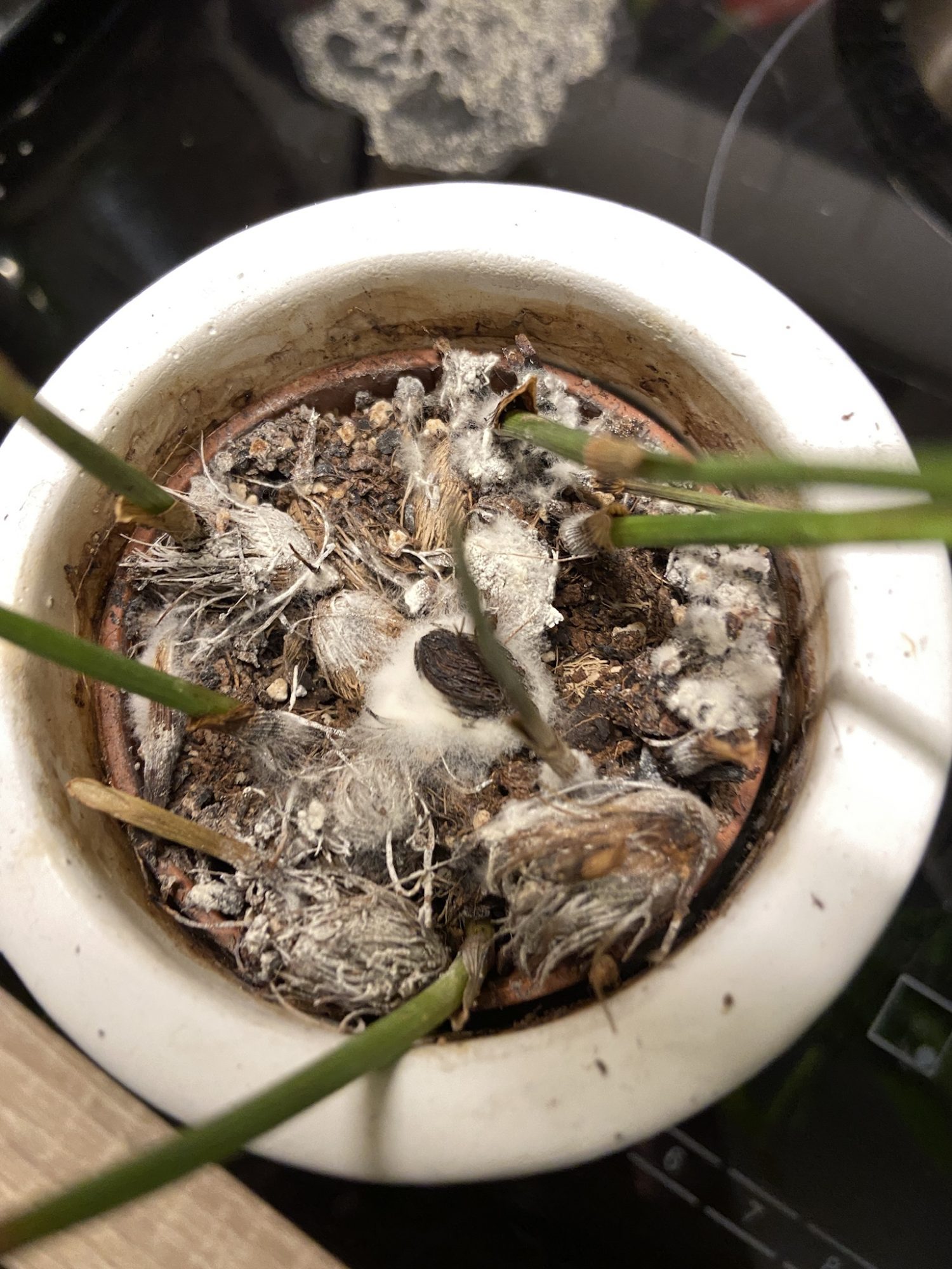 Hallo, für mich sieht das nach Schimmel aus ehrlich gesagt. Es sollte helfen wenn du weniger gießt, die oberste Erdschicht mit Quarzsand versiegelst oder gleich auf Granulat als Substrat oder oberste Erdschicht umsteigst (zb Seramis). Ist ansich nichts schlimmes, kennt wohl jeder mit Topfpflanzen.