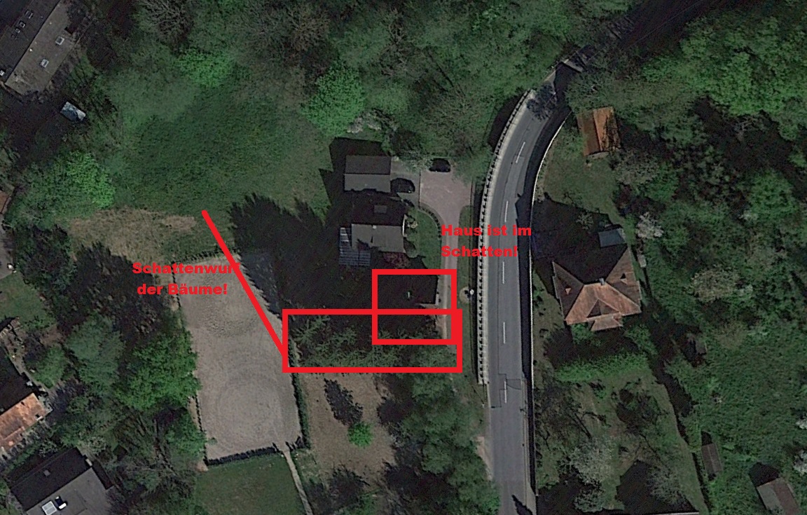 Zu Baubeginn ca 1990, auf der Grenze waren die Bäume ca. 2-3m hoch gewachsen. Inzwischen überragen diese aber locker die der Haushöhe von ca. 12m! Auf der nach SW gerichteten Terrasse kommt zur Zeit erst nach 16.00 Uhr die volle Sonne an! Der damals angelegte Rasen besteht fast nur noch aus Moos. Auch die an der Grenze gepflanzten Johannis - und Stachelbeeren wachsen nur spärlich.