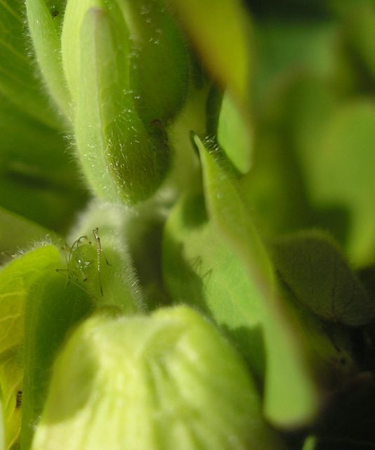 Blattlaus gut getarnt am Austrieb einer Akelei,