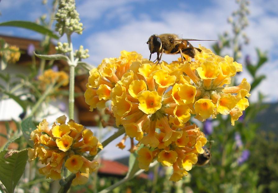 beim gelben Sommerflieder finden sich derzeit viele Schwebfliegen ein